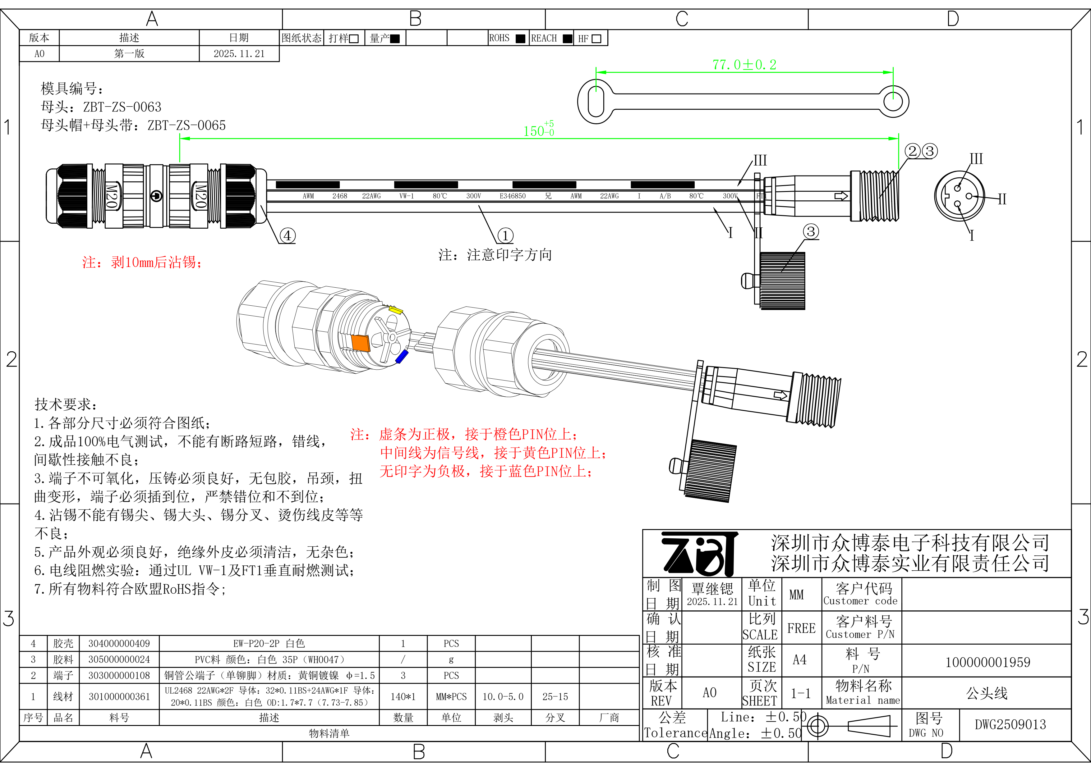Male / Female wires crimping-in connector cable 22AWG 150mm or customized cable length